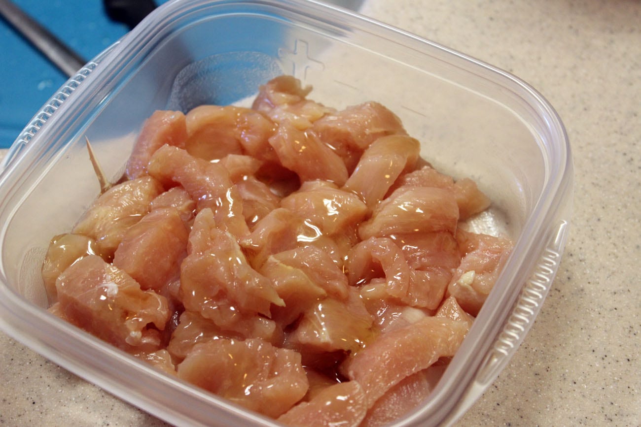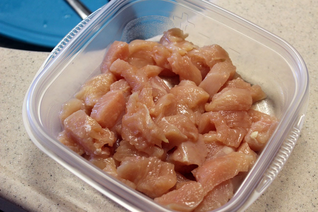 Thaw (if you’re using frozen) and chop the chicken into 3/4-inch cubes. If you want smaller pieces of chicken, feel free to cut them smaller as long as they’re all a uniform size.