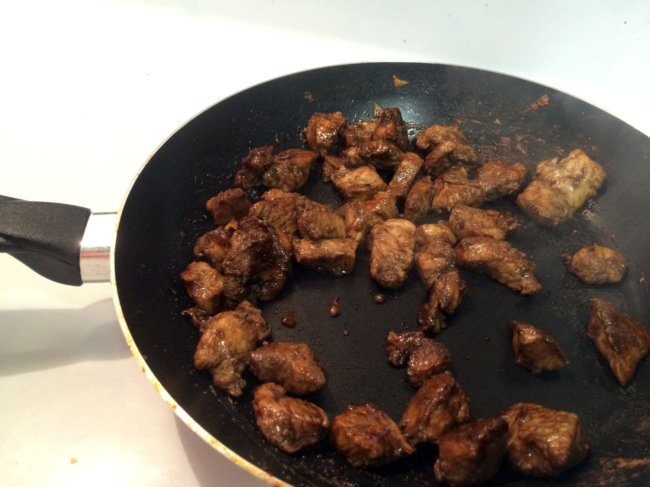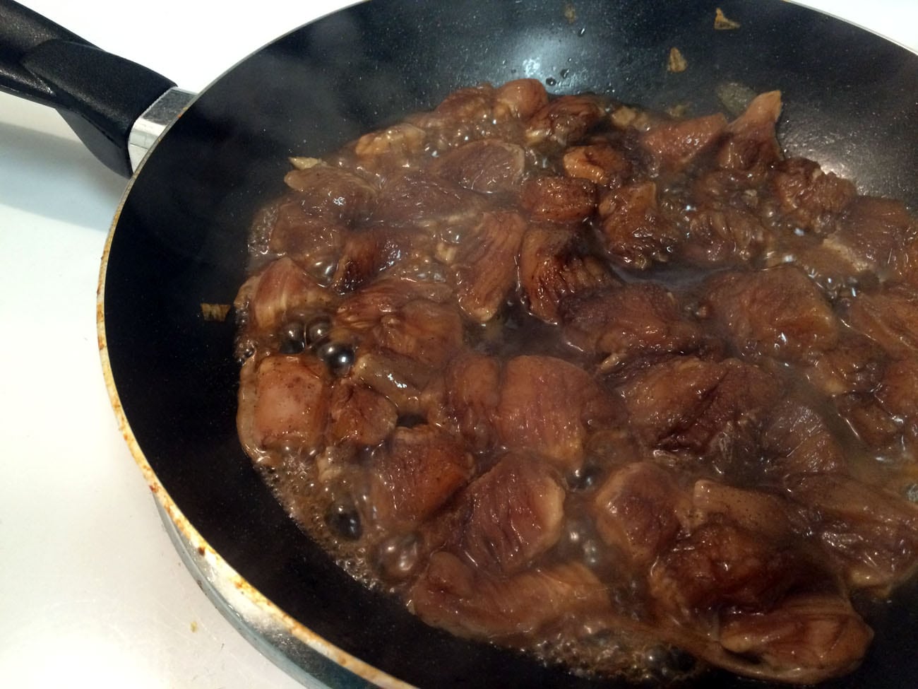 Once the liquid has evaporated, this is what the chicken should look like. I added a bit more soy sauce to give it a nice carmelization. And DON’T wash the pan right after you distribute the chicken. Add some water to the pan to get up all of that really delicious browned bits that are stuck to the pan. As you can see in the picture below, I poured the “sauce” over the chicken and vegetables to give it even more flavor.