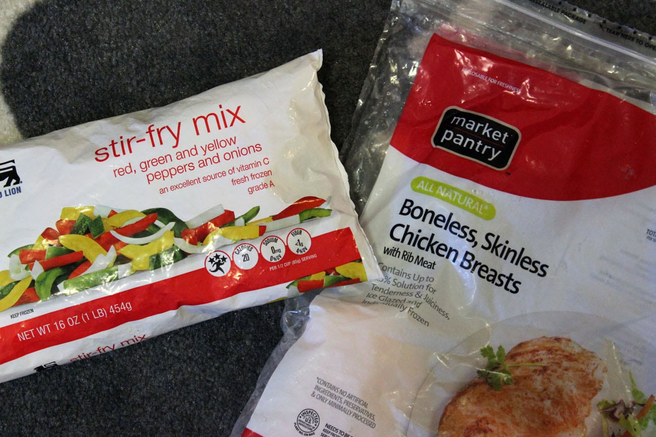 For the chicken, I really like the frozen boneless, skinless chicken breasts from Target. You get close to 8 or 9 breasts per bag at around $6. That’s not a bad deal considering 2 fresh chicken breasts will cost you around the same. I just picked up this stir-fry mix from Food Lion.