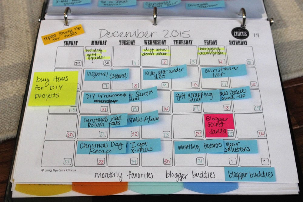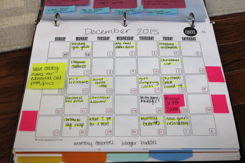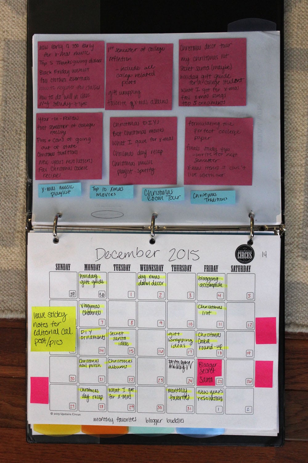 - PAGE FLAGS: these are all of my blog post ideas. By writing them on sticky notes, I am easily able to move them around. This keeps my calendar clean and neat.