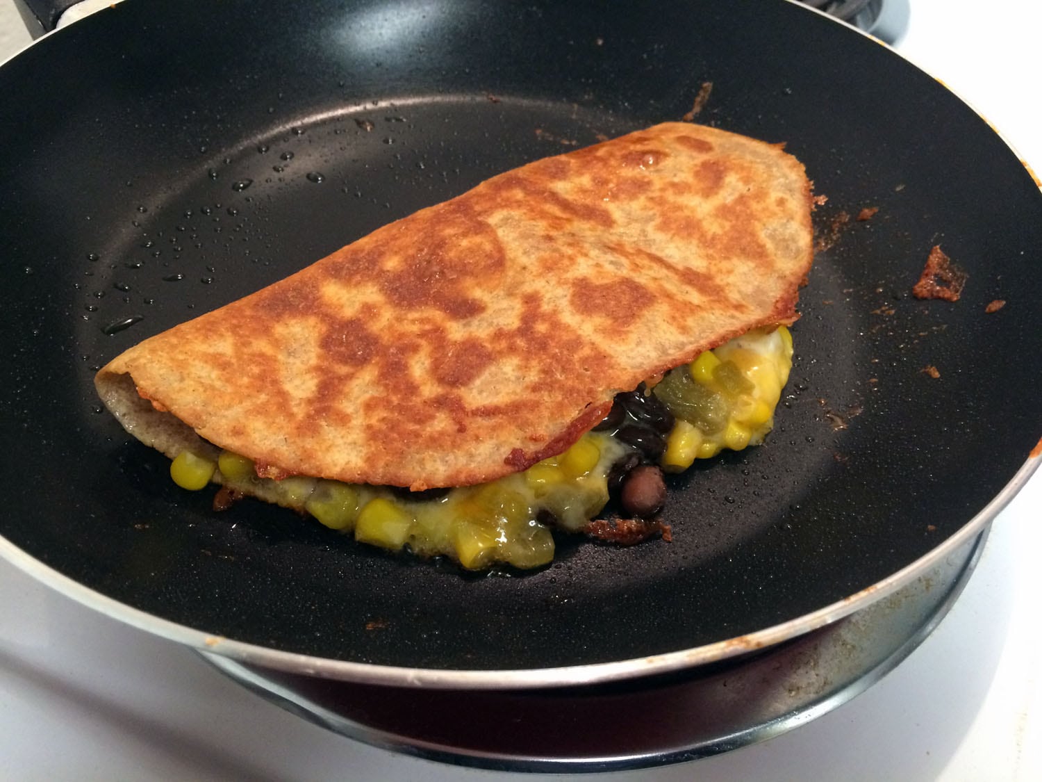 Fold over tortilla to seal in the bean mixture and the cheese. Like I said before, quesadillas are very easy to make and pretty self-explanatory. I cooked mine until the cheese was melted and the outside of the tortilla is crispy.