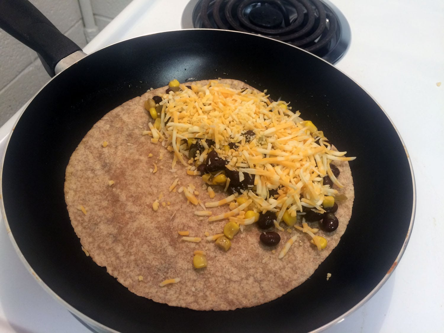 Place tortilla in heated pan with a bit of oil to make the outside a bit crispy. Then, add bean, corn, and green chili mixture to the tortilla and top if off with cheese.