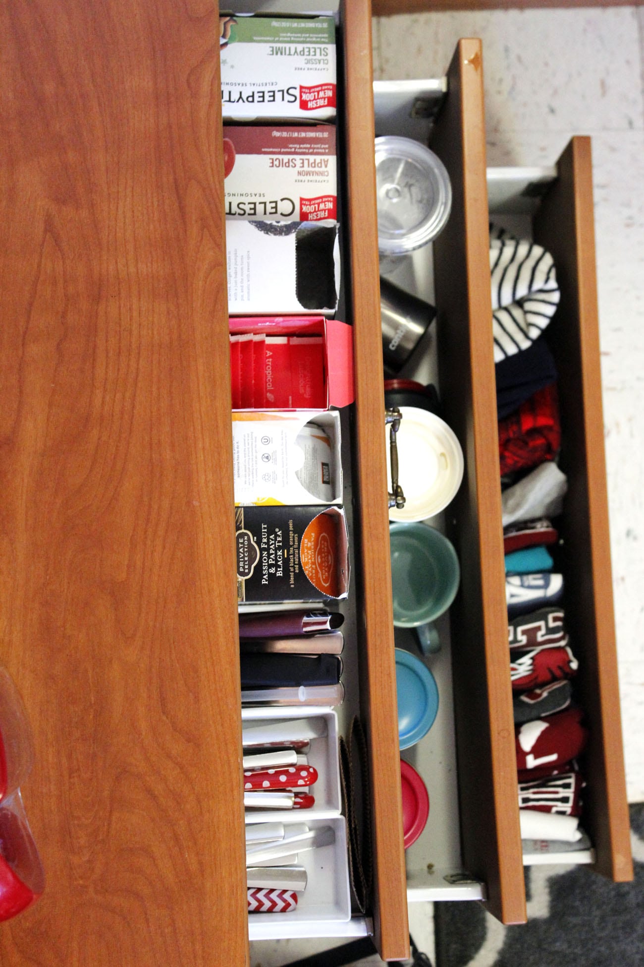 This picture is an overview of what my dresser drawer look like. In the shallow top drawer I keep all of my teas and silverware. It’s too shallow to really put clothes in so food works just as well! Below that I keep all of my cups, dishes, and random crap. It’s basically a junk drawer. And finally, the last drawer holds my sweaters and t-shirts.