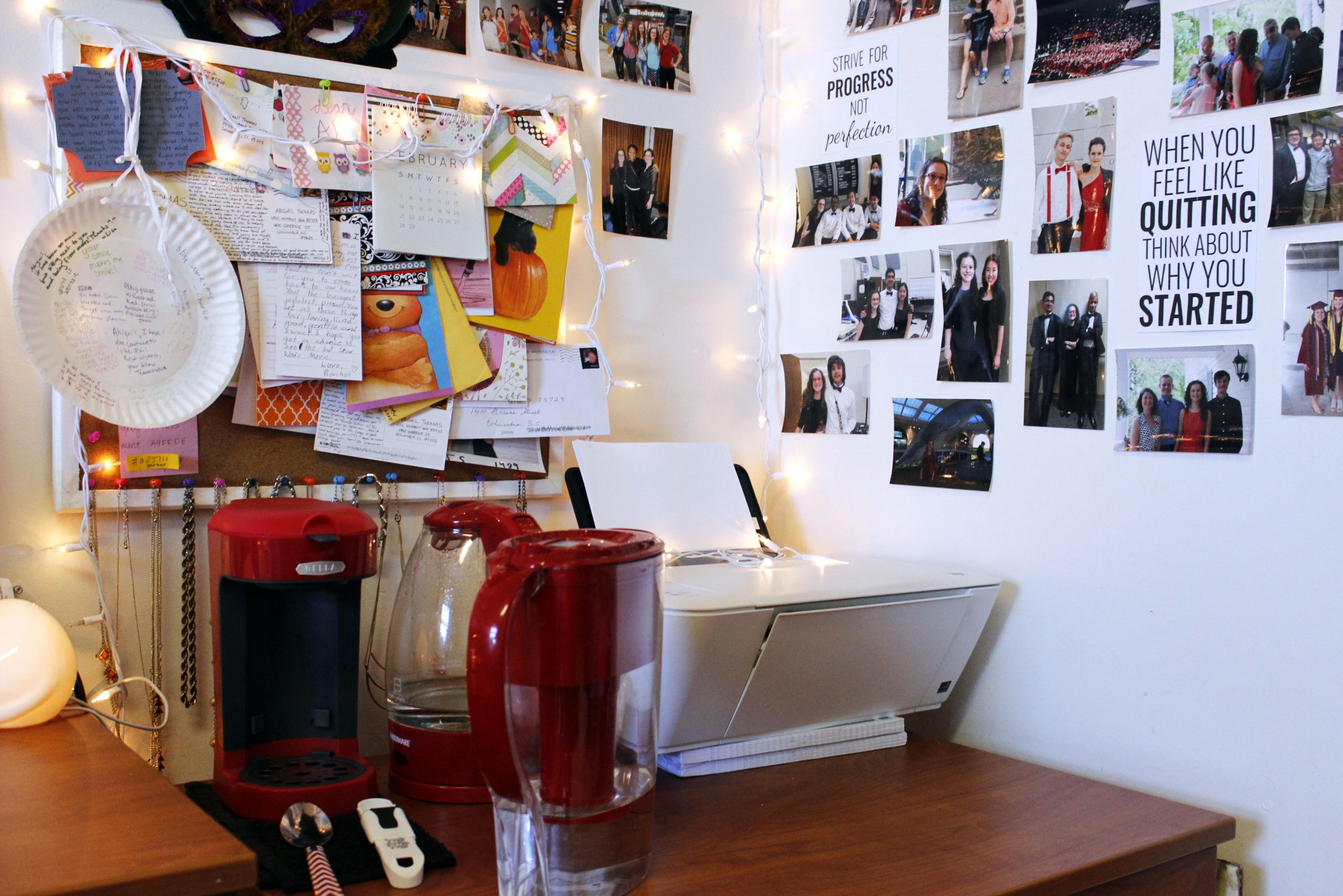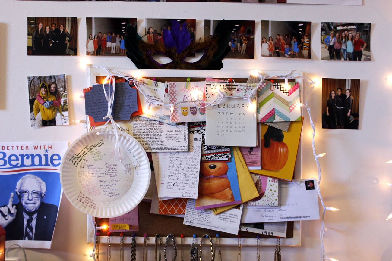 Immediately to the right of my desk I have a bunch of pictures and a cork board. Initially I didn’t want to bring a cork board to college, but I’m go glad I did! I use it to display all of the mail I’ve received over the years, and at the bottom of it, I just have my necklaces stored.
