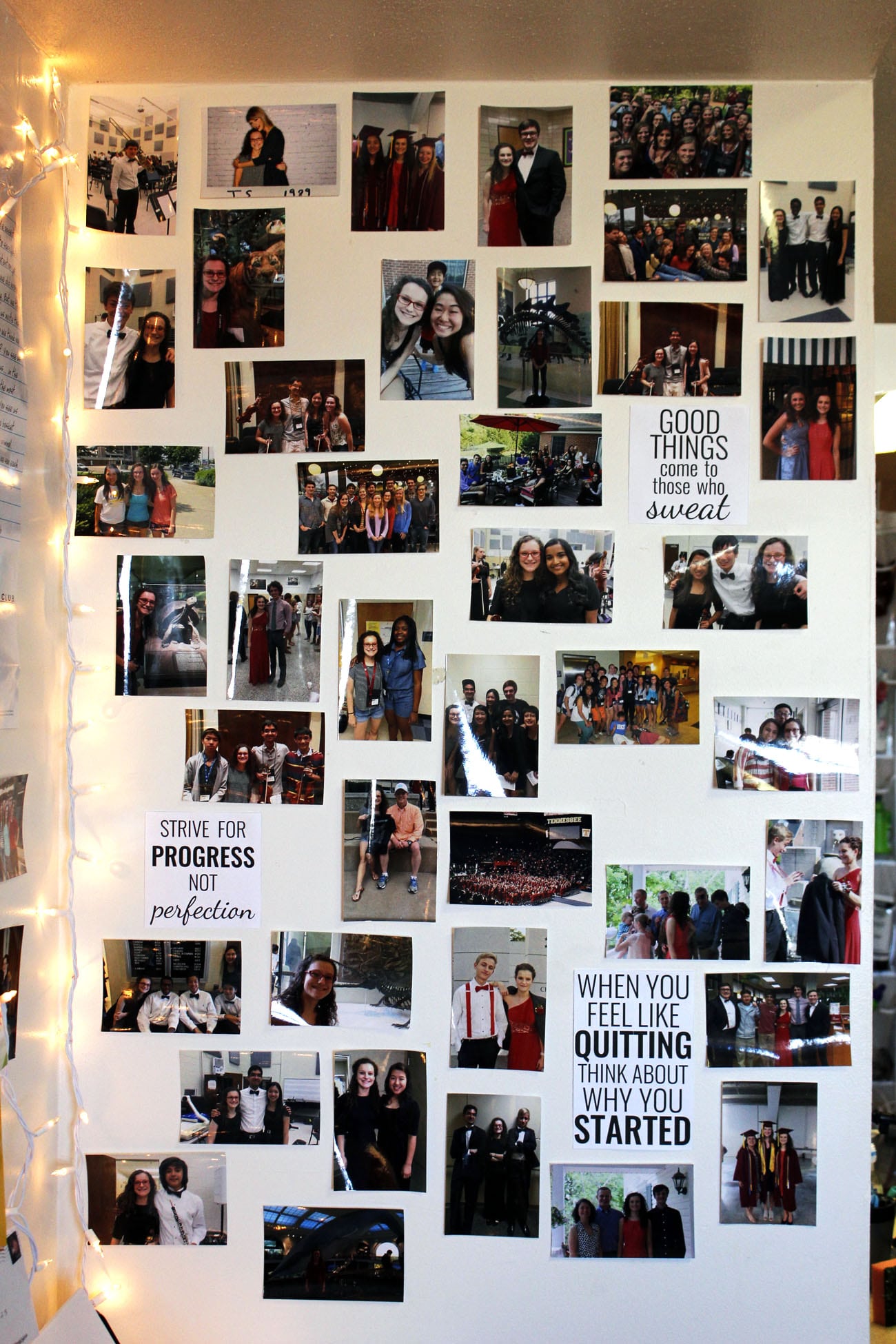 From the picture above, you can see a little bit of my picture wall! I love pictures of my friends and family because it really reminds me of so many great memories. I wanted to do something a bit different, and this picture wall is what I came up with. Before this was here, the wall was super bland and boring. I designed some motivational quotes to intermix within the pictures because motivation is always good!